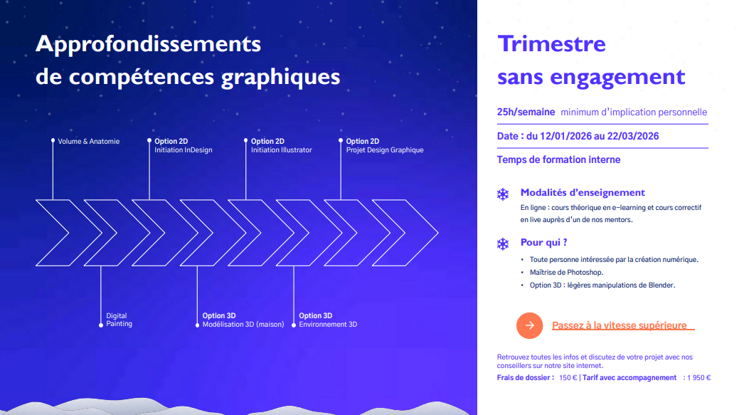 Avec plus de 100 mentors professionnels, tous en activité dans les domaines du design, de l’animation, du jeu vidéo ou encore de la création graphique, vous profitez d’une expertise concrète, ancrée dans les réalités du marché. Ces professionnels partagent leur savoir-faire, vous guident à chaque étape de votre projet et vous apportent des retours constructifs.